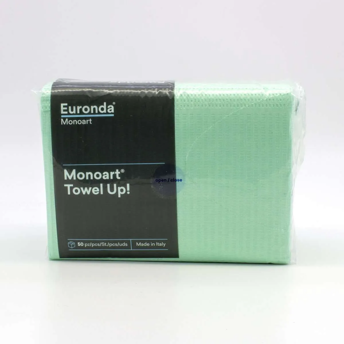 Las servilletas desechables Monoart® Towel Up se fabrican en celulosa altamente absorbente acoplada, 100% reciclable, biodegradable y gofrada con una capa de polietileno impermeable.
